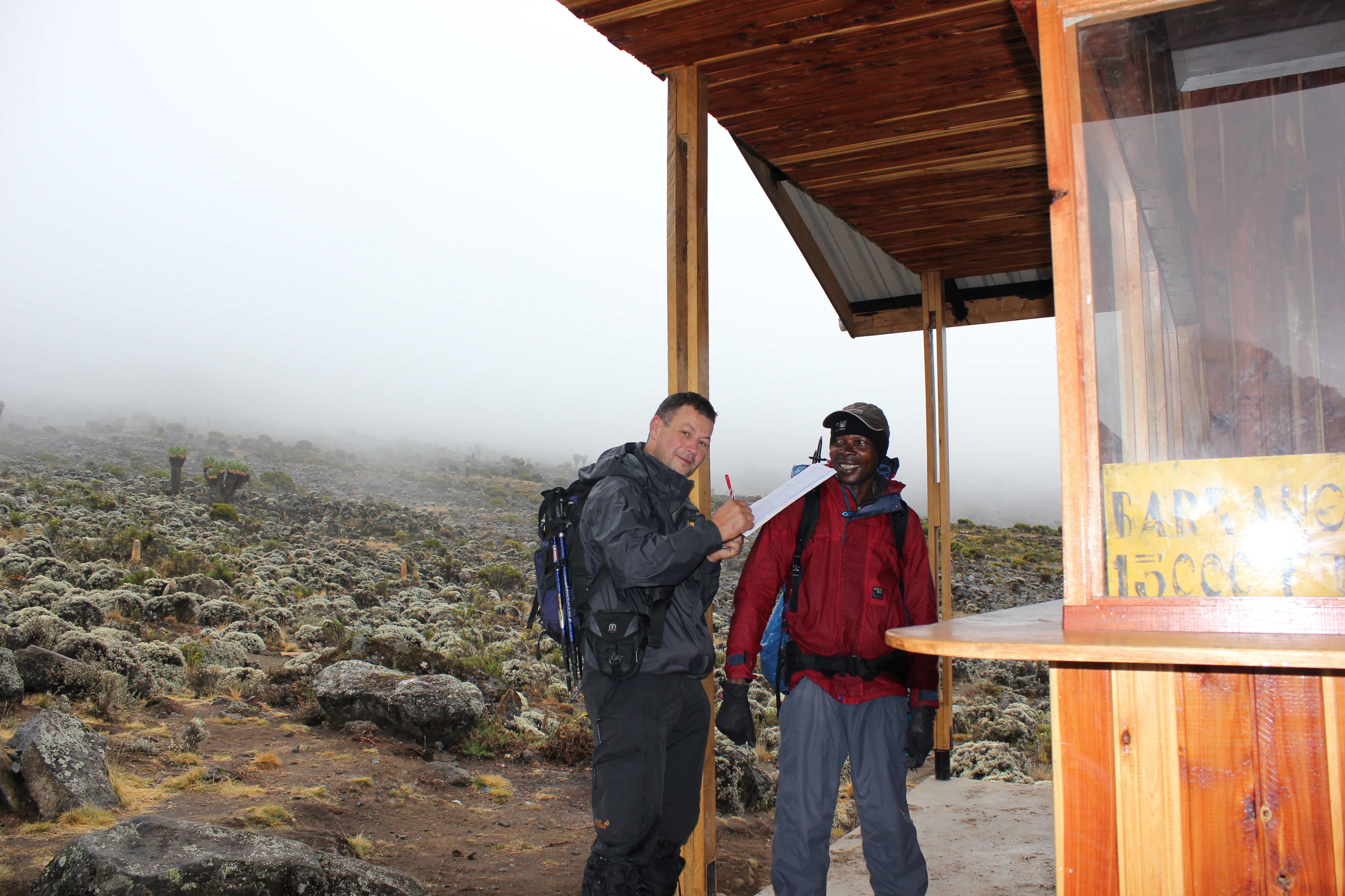 The rain gradually turned into a light snow, but by the time we had finished lunch and were ready to move on, it was little more than drizzle. Armed (or should I say “dressed”) in our rather attractive green safari poncho’s we set off once again towards the magnificent Lava Tower at 15,000ft. We had intended to climb up the tower, but due to the inclement weather, Mathew advised against it. From the Lava Tower, we trekked downhill through the immense canyon of Grand Barranco, to our base camp for the evening – Barranco Camp at 13,000ft.